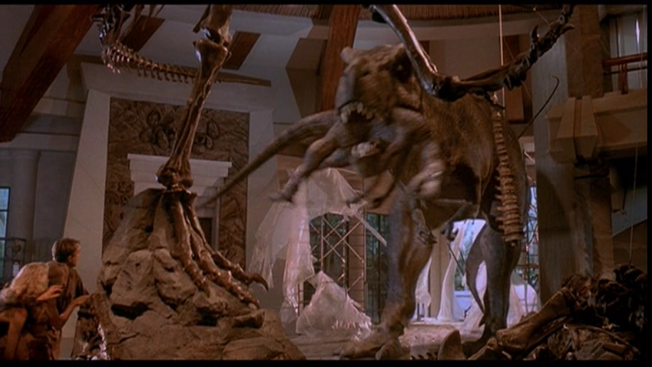 Schließlich werden Tim, Lex, Grant und Sattler von zwei Raptoren in die Enge getrieben. Im Sprung wird der Raptor plötzlich aus der Luft geschnappt: Der T-Rex ist da. Der zweite Raptor greift den T-Rex an und wird von diesem gegen das Tyrannosaurus-Skelett geschleudert, nachdem die Überlebenden bereits in den Jeep zum Flugplatz gestiegen sind.