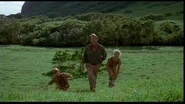 Hammond, Ellie, Grant, Malcolm y los niños se suben a un jeep para llegar al sitio en donde un helicóptero los espera para irse de la isla. Grant menciona, en tono irónico, que no apoyará al parque, una decisión que ahora Hammond también comparte. A bordo de la aeronave, los niños caen dormidos al lado de Grant, quien contempla a las aves volando en la cercanía —una de las especies evolucionadas que sobrevivieron a los dinosaurios, que ahora recreados han tomando control de la isla donde residiría el fallido proyecto Parque Jurásico.