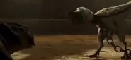 Leonard pertenecía a Kayla Watts, pero ella acepto vendérselo a Wigi cuando le ofreció comprárselo y Wigi lo obligo a luchar contra un Oviraptor en un anillo de lucha del que Leonard salió victorioso de inmediato cuando decapito al Oviraptor con su mandíbula. Mas tarde iba a ser obligado a enfrentarse a una cría de Carnotaurus, pero antes de que pelearan, Owen Grady y Rainn Delacourt cayeron en el anillo de lucha y comenzaron a pelear, Grady logro tirar a Delacourt al suelo y Leonard sujeto su brazo con su mandíbula, mientras el Carnotaurus le devoraba el otro brazo, lo que inmovilizo a Delacourt y le dio tiempo a Grady para interrogarlo sobre donde estaba Maisie Lockwood y luego un Baryonyx juvenil mato a Delacourt.