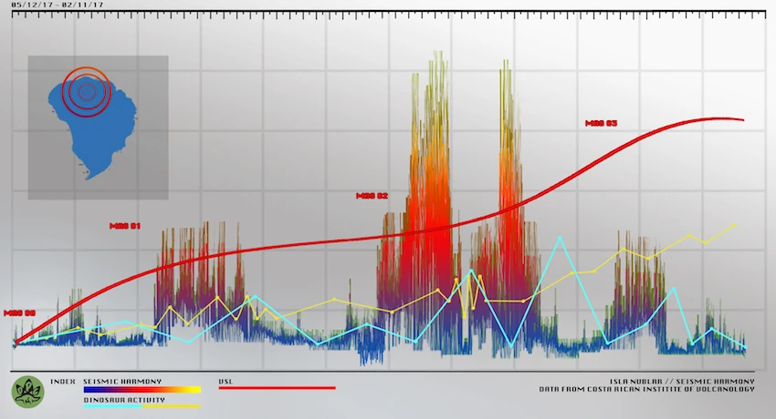 La documentación proporcionada por el DPG indica que, entre el 11 de febrero de 2017 y el 12 de mayo de 2017, el Monte Sibo aumentó de un VSL de MAG 0 ("Inactivo / Extinto") a MAG 1 ("Actividad Ligera") y MAG 2 ( Actividad Moderada”) antes de alcanzar la clasificación MAG 3 antes mencionada, que mantuvo durante aproximadamente un año. Las lecturas de resonancia armónica muestran dos picos significativos en la actividad en el momento en que se alcanzó MAG 2, a fines de marzo y principios de abril. En general, los picos en la actividad volcánica también provocaron cambios en la actividad de los dinosaurios en la isla, posiblemente debido a los efectos magnéticos causados por la gran intrusión de magma basáltico rico en hierro.