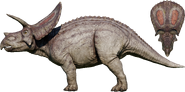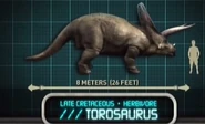 Aparece en el Jurassic Park 3 Park Builder, Jurassic Park Builder, en el JPOG y el Jurassic Park DVD Explorer. De ser comprobada la teoria acerca de que Torosaurus y Triceratops son un mismo genero, pasaria a ser una especie descartada sinonimo de Triceratops, quedando Torosaurus en desuso y siendo indirectamente protagonista de todas las peliculas novelas y juegos de Jurassic Park siendo un mismo animal pero con diformismo sexual y de desarrollo de edad, en el juego Jurassic Park: The Game, el diario de Laura Sorkin explica la metamorfosis de Triceratops a Torosaurus y que este ultimo es en realidad el Triceratops desarrollado. Torosaurus regresa para el juego Jurassic World: Evolution.