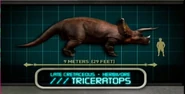 El triceratops se encuentra entre los ceratopsianos más grandes, con adultos fosilizados que alcanzan hasta nueve metros (29,5 pies) de largo y tres metros (9,8 pies) hasta la parte superior de su cabeza. Los especímenes de InGen alcanzan unos impresionantes 10,5 metros (34,4 pies) de largo y 4,5 metros (14,8 pies) de alto, superando las dimensiones de los especímenes fósiles; las estimaciones de peso para las criaturas de InGen varían de siete toneladas cortas estadounidenses a diez u once toneladas en los adultos más grandes (hasta 22.000 libras o 9.979 kilogramos). En realidad, esto no alcanza algunas estimaciones paleontológicas para el peso del animal, que se ha estimado en 6.5 a 13 toneladas cortas estadounidenses (13,000 a 26,000 libras, 5,896.7 a 11,793.4 kilogramos).