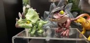 Sorprendentemente, la cabeza no tiene colores brillantes, siendo el volante más o menos del mismo color que el resto de su piel. Algunos especímenes, la mayoría de los cuales fueron criados para Jurassic World en el siglo XXI, presentan marcas verde azulado pálido alrededor de los ojos.