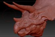El cráneo se extiende hacia atrás para formar un volante circular corto pero sólido formado a partir de los huesos escamosos externos y parietales internos, que define el imponente perfil de este animal cuando se ve de frente. El volante está decorado alrededor del borde con pequeñas protuberancias óseas llamadas epoccipitales. En Triceratops, estos son anchos y triangulares en la base, formando una franja en forma de diente de sierra. Los especímenes de InGen tienen entre dieciocho y veintiún epoccipitales en la edad adulta. En el diario de la Dra. Laura Sorkin, un dibujo representa un espécimen con veintitrés distribuidos asimétricamente en su volante; este patrón nunca se ha visto en ningún otro lugar. Muchos especímenes tienen cuernos en las mejillas llamados epijugals ubicados cerca de la base del volante; la mayoría de los Triceratops tienen dos a cada lado. Sin embargo, algunos carecen de estos.