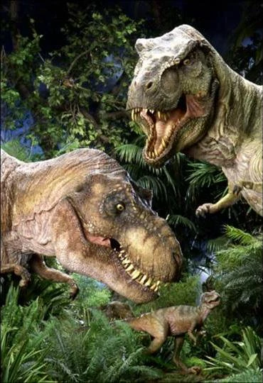 Grupo familiar de tiranosaurios. La madre (derecha) muestra afecto hacia su cria (centro), mientras que el padre (izquierda) mira mientras pasa una manada de estegosaurios (no en la foto), Isla Sorna, (23/2/1997)