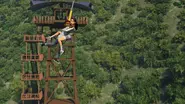 La tour commence à vaciller et Sammy tombe presque, pour être sauvé par Yasmina puis repris par Darius et Kenji également. Le groupe essaie d'utiliser la tyrolienne pour s'échapper, juste au moment où le frein d'urgence se déclenche, les laissant bloqués au centre de la tyrolienne. Alors que l'Indominus continue de percer la tour, Darius attrape Yaz pour essayer de créer suffisamment d'élan pour forcer les autres campeurs à atteindre l'autre tour de tyrolienne. Cependant, l'Indominus parvient à casser la tour, ainsi que la tyrolienne, faisant tomber les campeurs au sol.