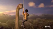 Zayna, Geba, Darius et Kenji retournent à la ferme et voient un Suchomimus attaquer. Sammy et Yaz le distraient tandis que Darius et Kenji lui lancent des pierres pour l'agiter. Le groupe parvient à effrayer le carnivore avec l'aide des herbivores et tout le monde se dirige vers la ferme pour se reposer et avoir une conversation avec les Mballos. Le lendemain matin, Darius est d'accord avec le reste du groupe pour dire qu'ils devraient monter la rivière, surtout après que Geba ait été kidnappée par des braconniers de dinosaures et que la boîte à œufs ait été volée.