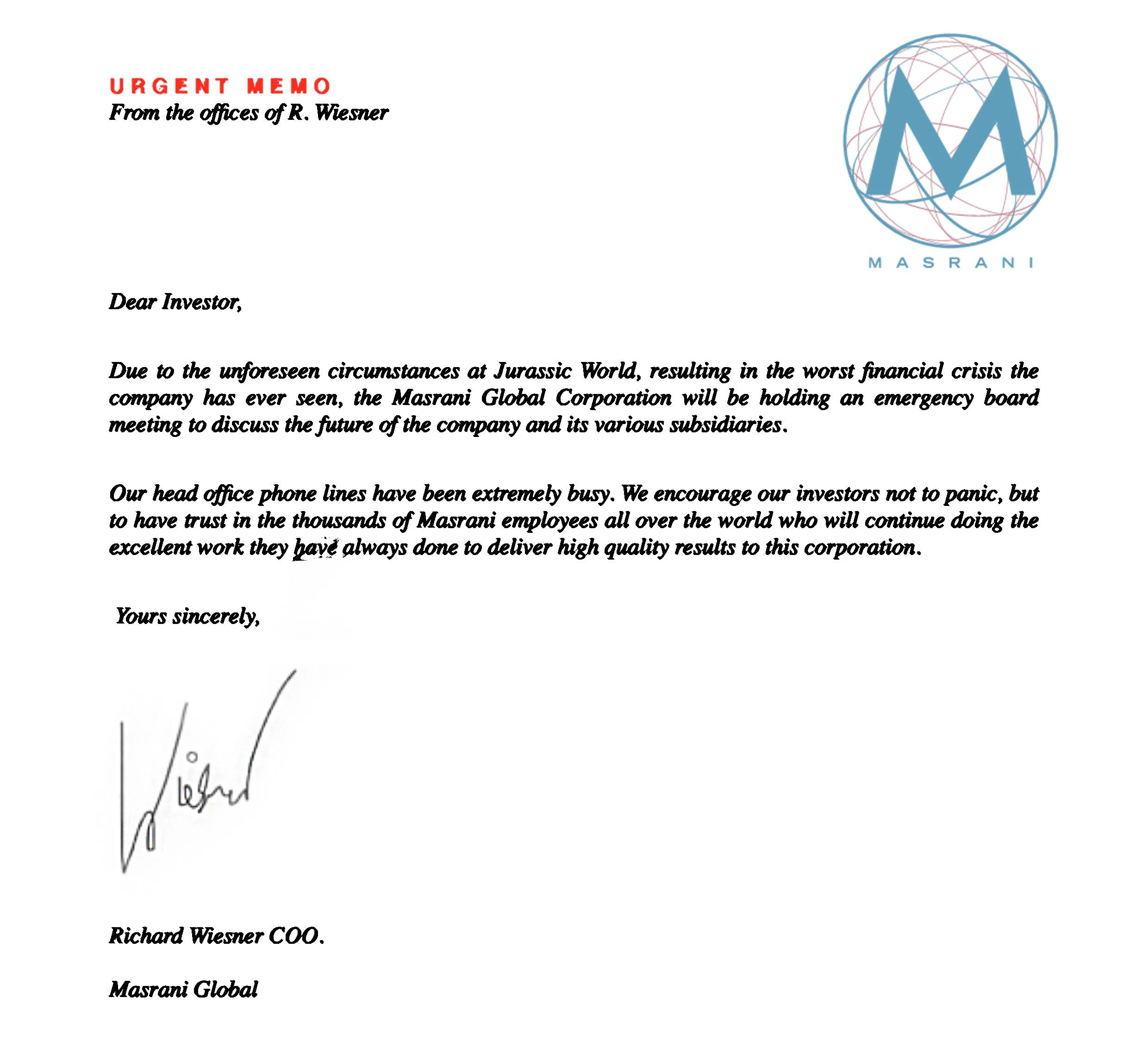 Après l'incident, le directeur des opérations, Richard Wiesner, envoya une lettre aux investisseurs de Masrani leur disant de ne pas paniquer et que la société allait avoir une importante réunion du conseil d'administration[3]. À la suite de cet incident, la société fut contrainte de payer 800 millions de dollars en dommages et intérêts et en actions en justice aux survivants[4].