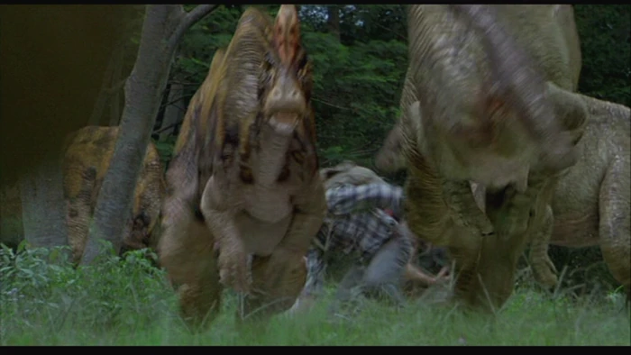 テリトリーであろう高原でお昼寝していたら突然、悪魔の子グラント博士らが慌てた様子で突っ込んできて「なんだなんだ?」と思っていたら背後から血に飢えたラプトルが迫っていることに気づき、「喰われたらヤワだ!」と言わんばかりに逃走した。 出番はたったのこれだけだが、グラント博士らと並走して逃げるシマシマボディの巨体は観客たちに大きな印象を与えた・・・と思う。 だといいですよね。