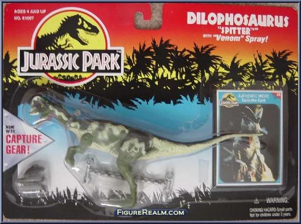 当シリーズでは上記の「狩りに毒を使った」説が採用されており、口内の唾液腺から毒を分泌して吐きつけて狩りや防衛を行う独自の生態が描かれており、そこから「スピッター(毒吐き)」の異名を持つ。吐く毒は蛇毒血清で早急に処置しなければ失明の可能性がある強力なものである。さらに映画では何故かエリマキトカゲのようなエリマキまで持つようになり、体格も実物より大きく描かれているヴェロキラプトルとは真逆にかなり小さくなっているなど、創作構想が非常に多い恐竜となった。(一応ジュラシックシリーズの恐竜たちは全て「劣化した不完全な遺伝子をカエルなどの他の生物の遺伝子で補って改造した上で」再生されているが……)