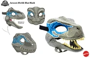 Морда Блю похоже по форме на рапторов, выведенных для Парка Юрского периода, но она шире, с наклонным гребнем задней орбитальной впадины и небольшим гребнем, спускающимся по середине верхней части ее черепа. Ее носовые впадины обращены вперед и выражены из-за дополнительной ширины черепа. Ее уникальное покрытие щитками наиболее заметно на ее орбитальном гребне, нижней челюсти, верхней задней части черепа и проходит по задней и боковым сторонам ее шеи. Форма ее тела тоже очень близка к рапторам Парка Юрского ериода, но более коренастая, с менее видной мускулатурой и скелетом.