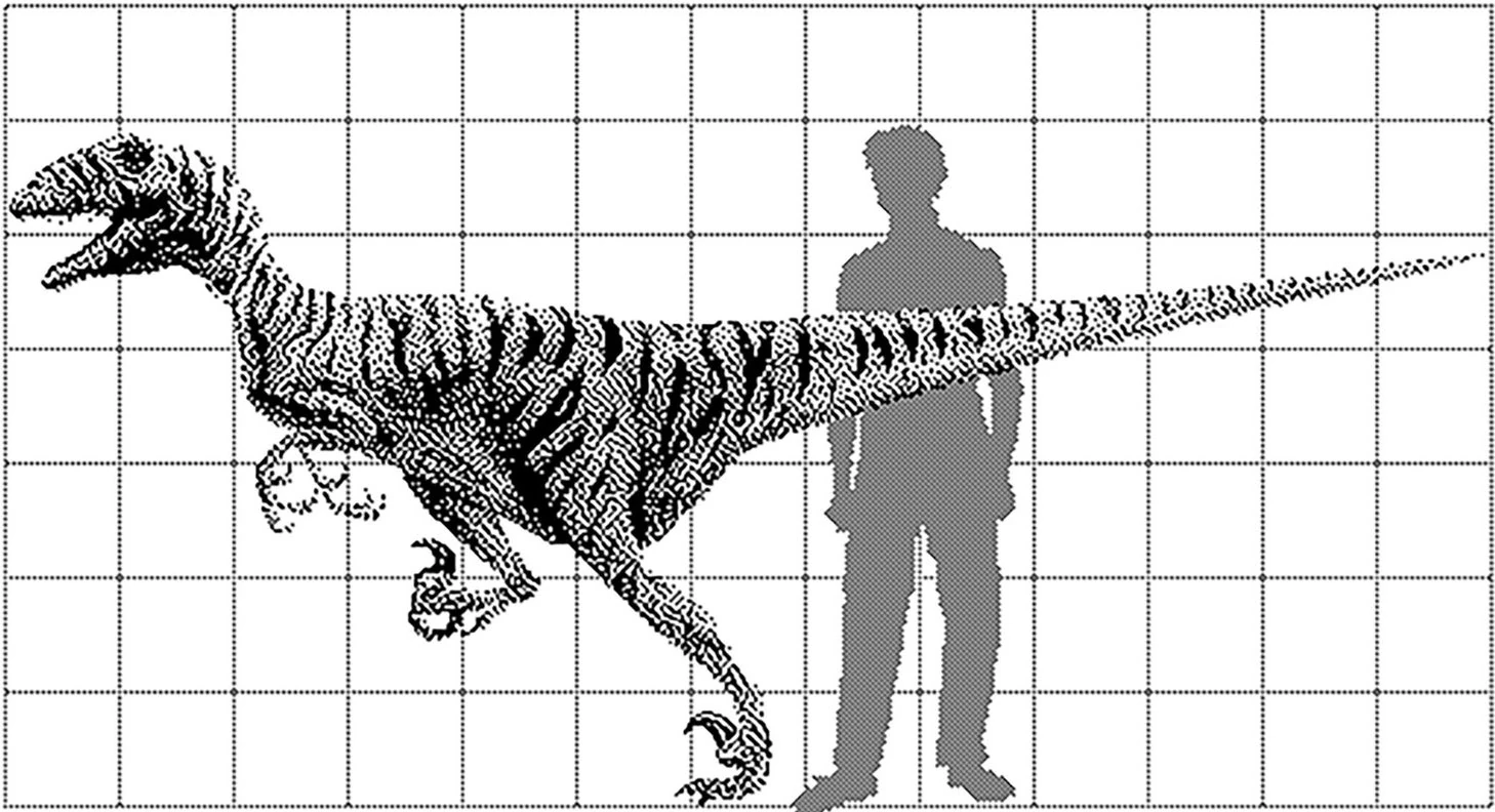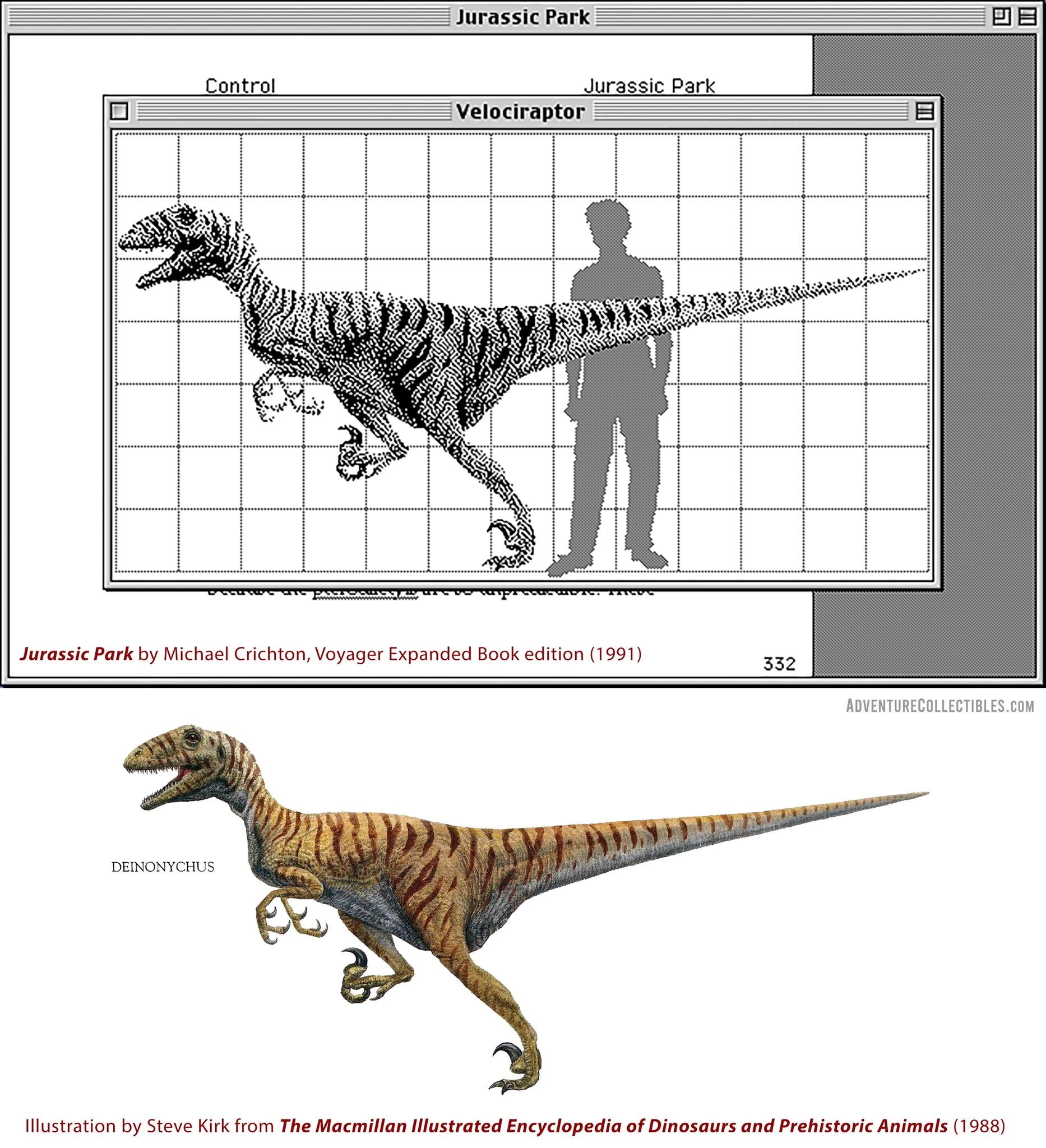 Изображение в 1 электронном издании романа "Парк Юрского периода" и иллюстрация Дейнониха из книги "The Macmillan Illustrated Encyclopedia of Dinosaurs" (1988)