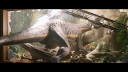 В 2027 году на острове Сен-Юбер семья Дельгадо, пережившая кораблекрушение, на второй день пребывания на острове оказались у реки, где в тот момент находился дилофозавр. Когда Тереса Дельгадо приближалась к складу аварийного снабжения E38, её заметил дилофозавров, который в тот момент поедал труп паразауролофа. Ящер выпрыгнул и направился к Тересе. Когда он уже собирался выплюнуть в неё яд, неподалеку дремлющий Тираннозавр проснулся, меньший хищник предпочёл удалиться.