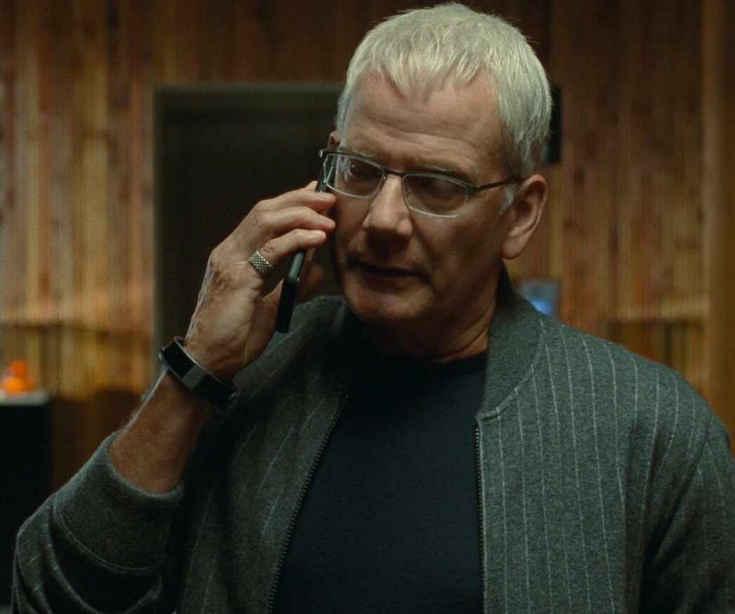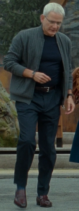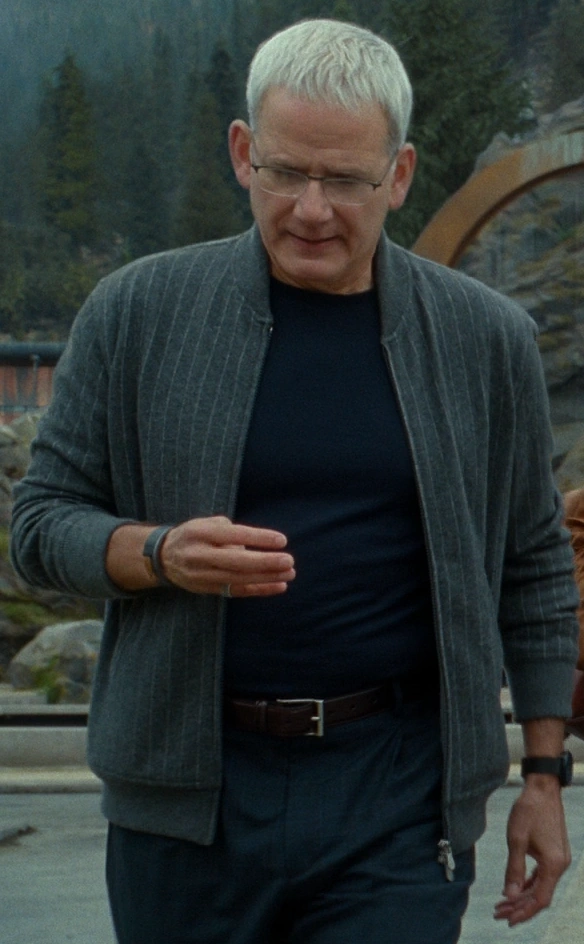 Доджсон носит трикотажную куртку-бомбер серого цвета в тонкую полоску от Brunello Cucinelli, тёмно-синюю футболку, коричневый кожаный ремень с серебряной пряжкой, тёмно-серые брюки, синие носки в тонкую полоску и коричневые ботинки. | Мир Юрского периода: Господство |