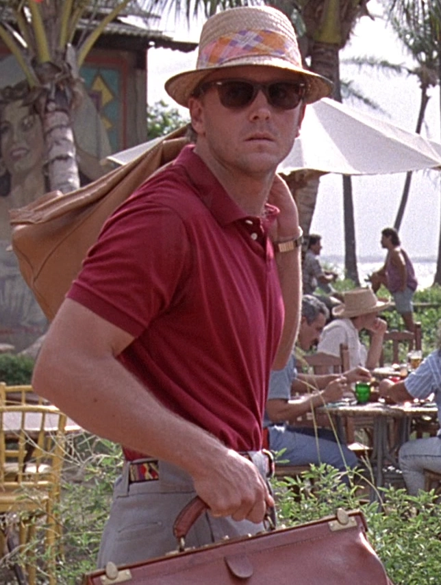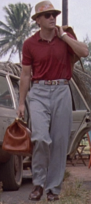 Доджсон носит соломенную шляпу с яркой лиловой лентой с белыми и оранжевыми узорами, красную рубашку поло, золотые наручные часы, обручальное кольцо, чёрный ремень с разноцветным узором и серебристой пряжкой, серые брюки, белые носки и коричневые ботинки. | Парк Юрского периода |