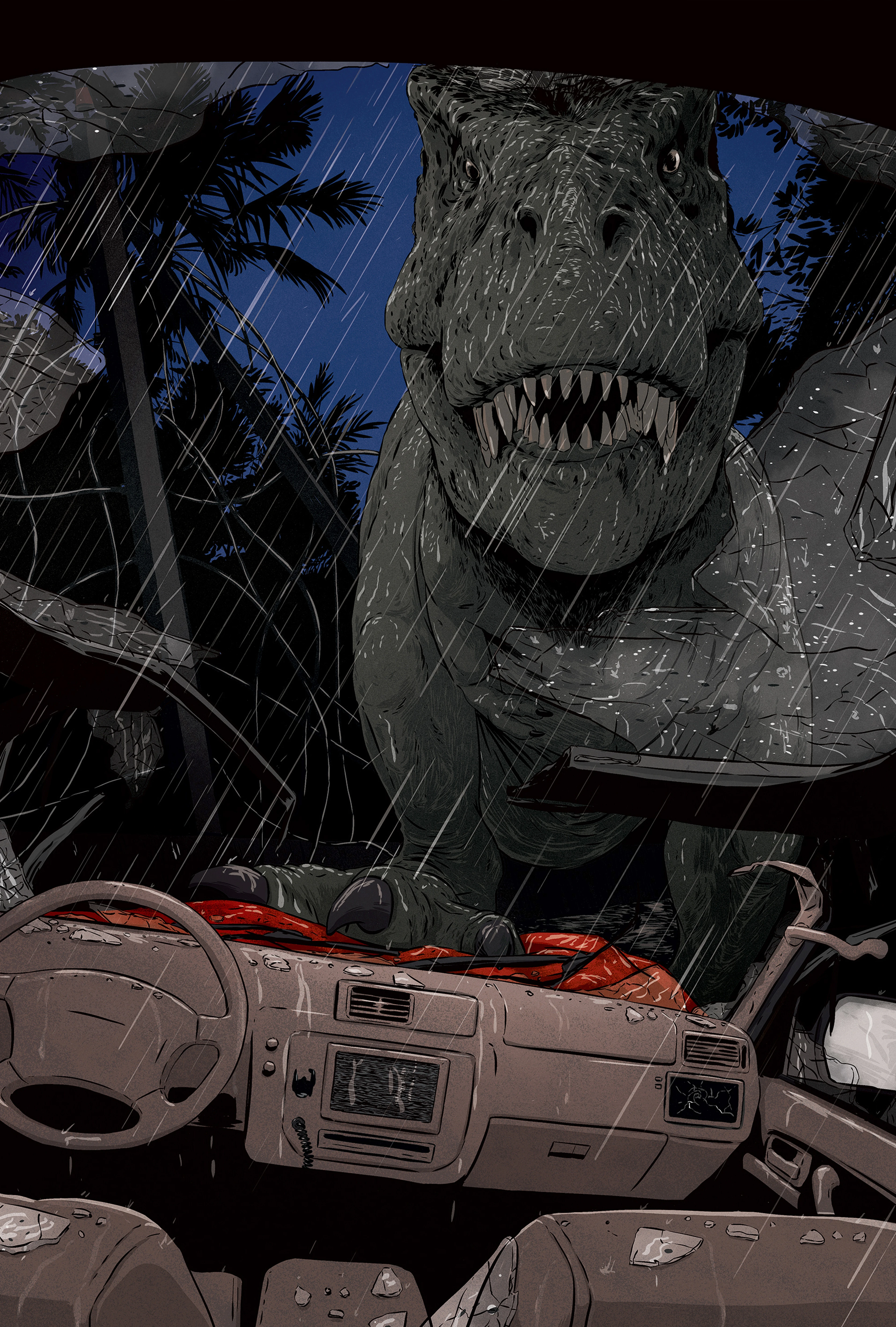 Когда Деннис Недри отключил электричество, Рекси смогла сбежать из загона. После того, как младший ти-рекс сбежал, она сделала то же самое. Используя свою заднюю конечность, она сорвала электрифицированный забор. После освобождения она решила напасть на джип Тима и Лекса Мерфи. Тираннозавр несколько раз избила автомобиль, серьезно повредив его и пассажиров, прежде чем она наконец не подняла машину в воздух, где её зацепило на дереве. Затем она продолжила обнюхивать землю. В то время как она это сделала, д-р Ян Малкольм, который был свидетелем нападения с доктором Аланом Грантом внутри джипа, решил покинуть машину и побежать в безопасное место, что было в направлении Тираннозавра. Рекси заметила его и жестоко отбросила, падение сломало ему ногу. После этого Рекси также заметила, что доктор Грант тоже оставил свою машину, но в отличие от Малкольма, доктор Грант остановился, не давая Рекси увидеть его. Но Тираннозавр покалечил его неосознанно, когда она ударила джип. Хотя они были ранены от нападения, все люди, которые пострадали от Рекси, пережили нападение.