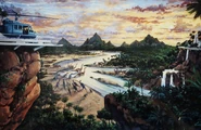 - Рик Картер не хотел, чтобы в вымышленном тематическом парке было «множество коммерчески ориентированных сооружений, которые кажутся пустыми, чрезмерно яркими и чрезмерно энергичными. Хотя это то, во что парк, вероятно, превратится, когда он будет достроен, я подумал, что с ними фильм он будет казаться незатейлевым. Это, в конце концов, не Диснейленд». Внешний вид центра для посетителей парка был основан на Иерусалимском храме. В дизайне интерьера присутствовала тема динозавров, включая скелеты и фреску, последнюю из которых выполнил художник Даг Хендерсон.