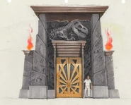 На тонированной двери был изображён рисунок яйца, из которого входили лучи света. Вокруг двери были выгравированы декоративные ископаемые динозаров, а в верхней части рельеф скелета - эмблемы парка.