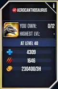 Acrocanthosaurus was made available in Jurassic World: The Game on November 3, 2017, as a legendary carnivore exclusive to VIP members.