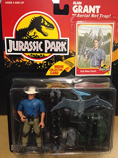 The Kenner Alan Grant is a toy originally released in 1993 after the release of Jurassic Park. The toy comes packaged in the classic Series 1 sunset packaging, with a figure of Alan Grant in a blue shirt and beige pants. He comes equipped with a net launcher, a backpack and a nuclear smart bomb to fend off the baby Pteranodon the comes with.