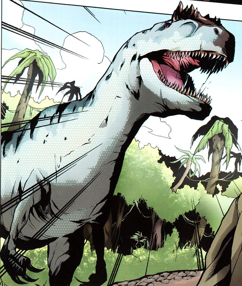 Allosaurus was one of the dinosaurs created by InGen for Jurassic Park in the comic series Jurassic Park: Dangerous Games. After the Isla Nublar Incident it became a wild species like most of the dinosaurs. During CIA agent Daniel Espinoza's time on Isla Nublar, an Allosaurus attacks him, in an attempt to steal the Parasaurolophus he hunted. He had downed as a means to feed himself. However, he is saved from the large theropod by Dr. Frances White's Velociraptor pack that kills the Allosaur.