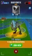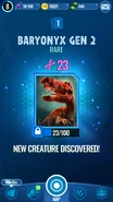 Baryonyx is a Fierce Epic creature in Jurassic World: Alive with a Fierce Rare GEN 2 variant that were both added in the worldwide release on May 24, 2018.