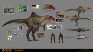 The Becklespinax clones have an appearance based on recent depictions by paleontologists that resemble Concavenator. Like many of the cloned theropods, they have pronated wrists. The clones also have large white spines sticking out from the back of their necks and a small sail on their back. One of them is colored jaded green with a red face, a yellow neck, and black markings; the other is colored various shades of brown, with splotchy darker markings on its snout.