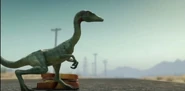 Two Compsognathus were seen on the side on the road and were fighting for a untouched sandwich. One of them leaves defeated, but as the victor tries to eat the food, it is grabbed by a Pteranodon before the sandwich gets destroyed by a passing car.[9]