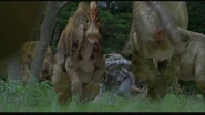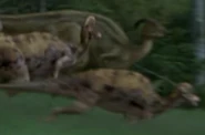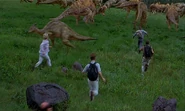 A herd of Corythosaurs and Parasaurolophus were grazing just outside of the InGen Compound that created them when Dr. Grant, Billy Brennan, Amanda, and Paul Kirby, and Udesky came out of the compound being chased by a pack of Velociraptor who, unknown to them, were after their eggs that Billy had secretly stolen from the raptors. The group ran through the herd of the two hadrosaur species causing a stampede. During the stampede, Billy nearly lost his backpack that contained the raptor eggs. The fleeing herd caused the group of humans to ultimately split up.[5]