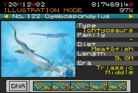Cymbospondylus is number 122 of the Carnivore Threes that can be created in Jurassic Park III: Park Builder.