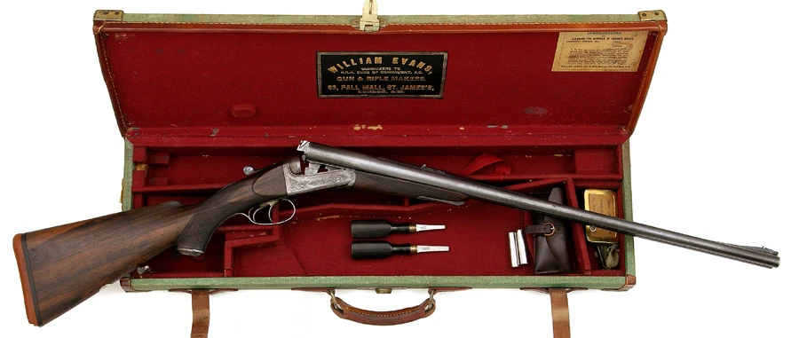 Roland's gun is a double rifle, chambered in .600 Nitro Express. The gun was made by Butch Searcy, a well regarded California gun builder who specializes in high end hunting rifles, mostly bolt actions and double rifles.