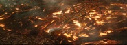 A lone Brachiosaurus, trumpeting pitifully, walked along the dock towards the departing vessel as though pleading to come along, rearing up majestically as she was enveloped in smoke and flame, her fiery demise mercifully hidden from sight. No one said a word. Even the mercenaries seemed stunned into silence by the enormity of the destructive volcanic event they were witnessing, as well as the death of the unfortunate Brachiosaurus. Claire in particular was moved to tears. Finally, someone closed the boarding ramp, cutting the fiery inferno that was once Isla Nublar from view as the Arcadia headed out to open sea, leaving the island and the rest of its inhabitants behind and now Isla Nublar is now but a burned up raging inferno island and a volcanic barren wasteland.