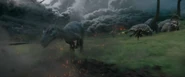 The predator circled the Gyrosphere, eying first Claire and Franklin inside and then Owen, before being distracted by a fleeing Sinoceratops. It attacked the herbivore and the duo fought, bumping into the Gyrosphere, causing it to roll over, shutting and locking the door, preventing Owen from getting inside. The Sinoceratops won the battle and fled, and the Carnotaurus, recovering, moved to attack Owen before being seized and killed by the Tyrannosaurus rex. She crushed the smaller carnivore's neck, breaking it, and then roared just as the volcano erupted, causing her to abandon her kill and flee with the other dinosaurs.