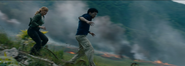 Meanwhile, Gryosphere 08 with Claire and Franklin inside rolled away under its own momentum and was caught up in the stampede. An Allosaurus ran alongside it and tried to attack it, but was hit by a falling magma rock, and eventually the entire stampede as well as the Gyrosphere went over a cliff and into the sea. It floated momentarily, but soon began to fill with water and sink as it was pelted with fiery chunks of rock, surrounded by flailing, drowning dinosaurs. Owen jumped in after his friends and swam down after the sinking the Gyrosphere. He tried to use the gun he'd taken from the dead mercenary earlier, but the bullets failed to penetrate the thick glass. He ran out of air and swam up. A panicking Franklin thought he'd abandoned them, but a few moments later, Owen swam back down, and this time started using his knife to try and pry the locked door open. This, combined with Claire and Franklin kicking it with their feet, finally got the door open, and the three swam to the surface as the now empty Gyrosphere sank to the bottom of the sea.