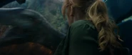 As the vehicles neared Blue's location, Owen suggested they stop so he could go ahead on foot, fearful that the noisy trucks would frighten Blue off. Wheatley again acquiesced, promising Owen he had his back if anything went wrong. Telling the mercenaries to wait for his signal, Owen headed off alone, eventually finding himself inside the old T. rex paddock with the wreck of Explorer 04 lying at the base of the tree where it had fallen years before. Blue leaped out, hissing and snarling at Owen, refusing the treats he'd used to give her when she was a baby.