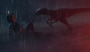 The Nublar Six get Ben to shelter as he slips in and out of consciousness and becomes delirious. After he mentions Gia, Kenji recalls that her car, which he and Sammy used to enter the valley, should still be at the entrance gate. Brooklynn and Kenji race off to retrieve the car, but a group of Atrociraptors smell Ben's fresh blood and attack. Darius fends off the raptors as everyone gets into the car and they head to the airfield, but the raptors follow closely behind. As Ben continues to deteriorate, the car gets stuck in a patch of mud, and the raptors surround them. Rexy, Buck, and Doe suddenly arrive and fight off the raptors, giving the Nublar Six time to escape and reach the airfield as the last helicopter prepares to leave. The tyrannosaurs roar together until the doors close. Ben and Kenji are flown to the hospital while the others stay behind and help the remaining Biosyn employees with caring for the many injured dinosaurs in the valley. Sometime later, Gia brings Ben to recover at Darius' cabin in California, where Kenji now lives. Darius has been helping with the dinosaurs in Biosyn Valley, Yaz and Sammy are working with Dr. Wu and running a support group for farmers affected by the giant locusts, while both Sammy and Brooklynn have started reconnecting with their families.