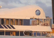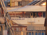 Visitors are brought to the island on large ferry boats from the American mainland; possibly Costa Rica. The ferries have two levels. Their colors are in the style of the park. The boats are white with blue lines. The back of the boats features the textless park logo.