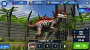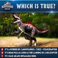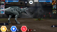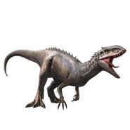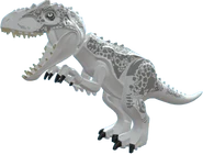 Indominus rex appears in Jurassic World: The Game as a legendary hybrid carnivore. Originally, she could only be unlocked by codes from Brawlasaur toys for use in the Battle Arena, but ever since June 10, 2015, she can be created for the player's park by fusing a Level 40 Tyrannosaurus rex and a Level 40 Velociraptor. There are two Brawlasaur variants in the game, one that is tan with lime zigzag striping and another that is light teal blue with dark blue stripes. Regardless of the color, they share the same stats. A Gen 2 version was also added to the game on December 20th, 2019. It can be created the same way as the Gen 1 version, only using the Gen 2 versions of both Tyrannosaurus rex and Velociraptor.