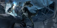 That night, in the restricted area, the members of Jurassic World's Velociraptor pack found her. However, when she began communicating with the raptors, Owen realized and remarked that the Indominus was part raptor. She became the alpha of their pack. Usurping command from Grady, she ordered the raptors, now under her control, to attack the humans that came with them and were in the area, to which they followed this order. Upon the initiation of this order, the InGen Security troopers, Owen, and Barry Sembène, who were following the Velociraptors opened fire on the hybrid. She managed to escape the brawl that ensued as the small arms fire had little to no effect on her, but she did nearly collapse on the ground when she was hit by a rocket from one of the troopers while escaping.[5]