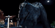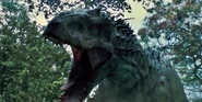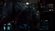 The T. rex carried out a heavy assault on the Indominus, and the two dinosaurs engaged in a ferocious battle. Though the T. rex initially dominated the fight, she was eventually brought to the ground by the hybrid's inhumane strength, destroying the Jurassic Traders Outpost and almost killing Owen Grady, Gray, and Zach in the process. The Indominus almost delivered the killing blow before she was attacked by Blue, who had somehow survived the onslaught. This allowed the tyrant to recover and, biting the neck of the I. rex, shove her into many of Main Street's buildings, all while Blue assisted the Tyrannosaurus. Finally, she was flung to the edge of the Jurassic World Lagoon. The attacks from both the T. rex and Blue were so heavy that it caused the hybrid to actually bleed and pieces of metal were even sticking out of the left side of her torso. The I. rex got back up from the ground, however, still ready to fight the theropods once more. But while she let out a roar, the lagoon's resident Mosasaurus sensed the hybrid's presence and proceeded to emerge out of the water to pull the I. rex under the water to her death, avenging the victims she had killed.[5]