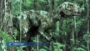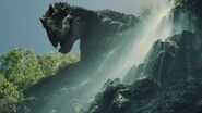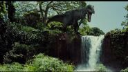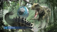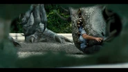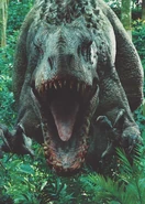 She then found brothers, Zach and Gray Mitchell, who were observing four Ankylosaurus in the island's Restricted Area after traveling through the opened gate and attacked the two. In her attack, one of the Ankylosaurus proceeded to fight back against her (mainly to protect a young Ankylosaurus), though her counterattack ended with her being killed by the Indominus which rolled her onto her back and snapped her neck. She resumed attacking the two brothers by piercing her mid talon into the glass and rotated the vehicle so the boys could see their demise. She then attempted to chomp the Gyrosphere whole but got her mouth stuck. She attempted to smash it several times into the ground to crack it open, but the two brothers escaped by barely getting out of their damaged Gyrosphere and jumping off a waterfall in time. She gave out a loud roar in disappointment and headed to the Gyrosphere Valley.[5]