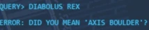 The name of Indominus rex also changed throughout its design process as well. In the Jurassic World storyboard by David Lowery, the Indominus is referred to as "Malasaurus" and "Malusaurus".[35] Another name for Indominus rex was "Diabolus rex"[43] or "D. rex",[38][44][45] which was a nickname that ILM used for the hybrid before it was given a final name.[46] When Diabolus rex is entered into the "Query" of the Masrani backdoor, the console will reply with an error message saying "Did you mean Axis Boulder?"[47] But if Axis Boulder is entered it will say it is an unknown command. Axis Boulder in itself is an anagram of Diabolus rex.