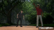 The Indominus rex sneaking up on two workers trying to warn the kids at Camp Cretaceous.