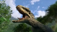 The Indominus then came across a group of campers from Camp Cretaceous. After killing a Brachiosaurus and two employees trying to warn them, the Indominus tried to get Darius Bowman, Brooklynn, Ben Pincus, Kenji Kon, Sammy Gutierrez, and Yasmina Fadoula by tearing down the observation deck they were on. However the campers managed to elude her by using a zip-line to escape. It then tore apart their campground before coming across a caged Carnotaurus named Toro and used its great strength to tear down the fence, setting him free.[19]
