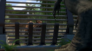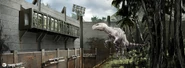 That same day, the Indominus later managed to avoid her temperature being picked up by the thermal cameras thanks to the frog DNA in her species and left claw marks on the walls to make them think she was able to climb over the enclosure's wall. When Owen Grady, paddock supervisor Nicholas Letting and worker Nick Kilgore came in to investigate the damaged paddock, the hybrid ambushed them as soon as they got word that she was still in the paddock, making a quick meal out of Kilgore in the process. As they fled, she managed to break through the door as it was not fully shut. Free at last, the I. rex managed to detect and eat Letting, but Owen narrowly evaded her by hiding under a nearby car outside of her paddock and then cut the car's fuel line, masking his scent. The Indominus rex then headed off toward the Jurassic World park, attracted by the thermal signatures of the visitors there.[5]