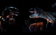 The vehicle stops and sees Blue, the Velociraptor that comes out from ACU van with Owen Grady rides on his motorcycle to tell the riders to stay seated before commanding his raptors to help them escape to safety and raced towards the Main Street until they meet up with Claire Dearing that stood by opening the paddock to release Tyrannosaurus rex by using the road flare to take down Indominus with more teeth. The riders confronted by Indominus that's about to attack them, but T. Rex interferes and went engaged on Indominus while buying the riders time when the vehicle enters the theater that was left in a mess. When Indominus pinned down T. Rex, it noticed the riders in the building and roared at them when Claire throws the road flare at the hybrid's eye and the Velociraptors attack, giving the T. Rex enough time to regain her strength and finally defeating Indominus by knocking her down, crashing through the building with her head hanging from a hole in the ceiling. The fight ends when the vehicle made it to the unloading area where riders exit the ride into the gift shop. It is unconfirmed whether Indominus was still alive or dead.