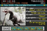 Majungasaurus (under its synonym, Majungatholus) is no. 005 of the Carnivore Twos that can be created in the game Jurassic Park III: Park Builder.