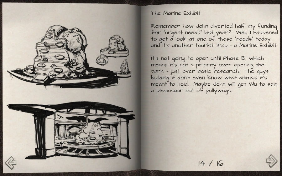 Laura Sorkin wrote in her Journal that Hammond cut half of her research funding for 'urgent needs'. A year later Sorkin saw that the funding was used to build the Marine Facility, she thought that Dr. Wu, with the help of the then newly hired Dr. Kajal Dua, may have created a Plesiosaur as the main attraction. Later, she later saw that it housed a Mosasaur.