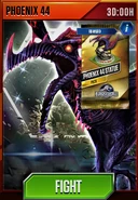 Phoenix 44 is a purple Pterodactylus with razor sharp pink teeth and spikes along its beak, neck, crest, and wings. It has "cracks" in which pink light will occasionally flash and also has pink electricity pulsing from the animal as seen when it flies, attacks, gets up, or roars. It is unknown if Phoenix 44 is a hybrid or simply a genetically enhanced Pterodactylus. Its only appearance so far is Jurassic World: The Game.