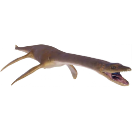 Pleisiosaurus is distinguished by its small head, short snout, long and slender neck, broad turtle-like body, a short tail with a fluke at the end, and two pairs of large, elongated paddles. Plesiosaurus fed on belemnites, fish, and other prey.